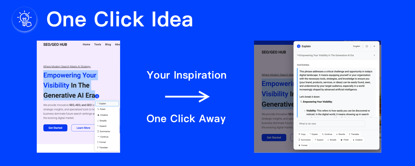 Transform your browsing experience with One Click Idea – the ultimate AI-powered text assistant that works directly in your browser.